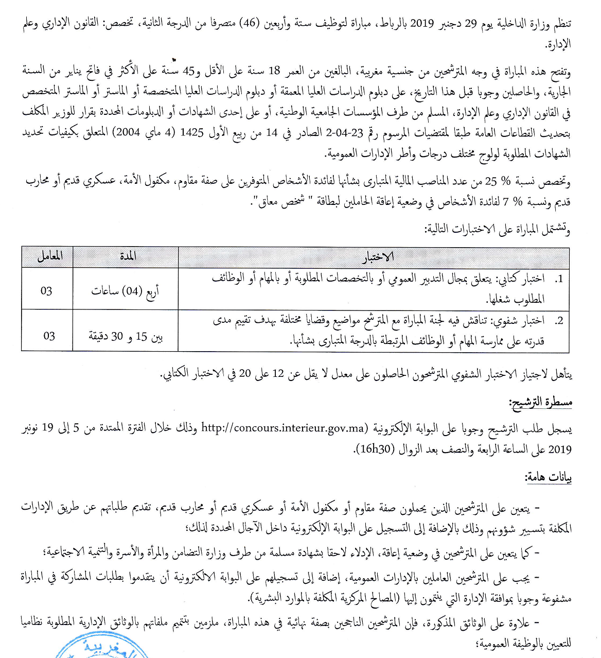 وزارة الداخلية 0 وزارة الداخلية: مباراة توظيف 46 متصرفا من الدرجة الثانية، آخر أجل للترشيح 19 نونبر 2019 Admin إعلان عن إجراء مباراة توظيف متصرفين من الدرجة الثانية رابط الترشيح وزارة الداخلية Admin مقالات قد تهمك تعليقات
